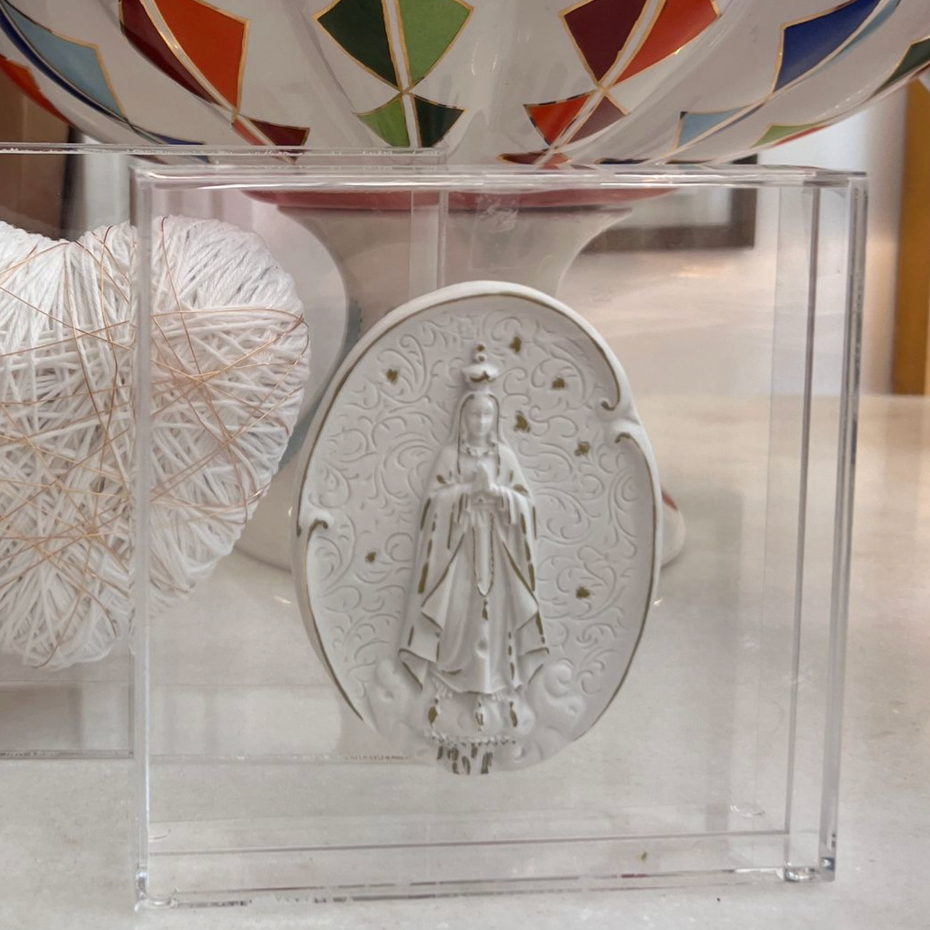 Escultura da Nossa Senhora de Fátima. A peça é protegida por caixa acrílica expositora em...