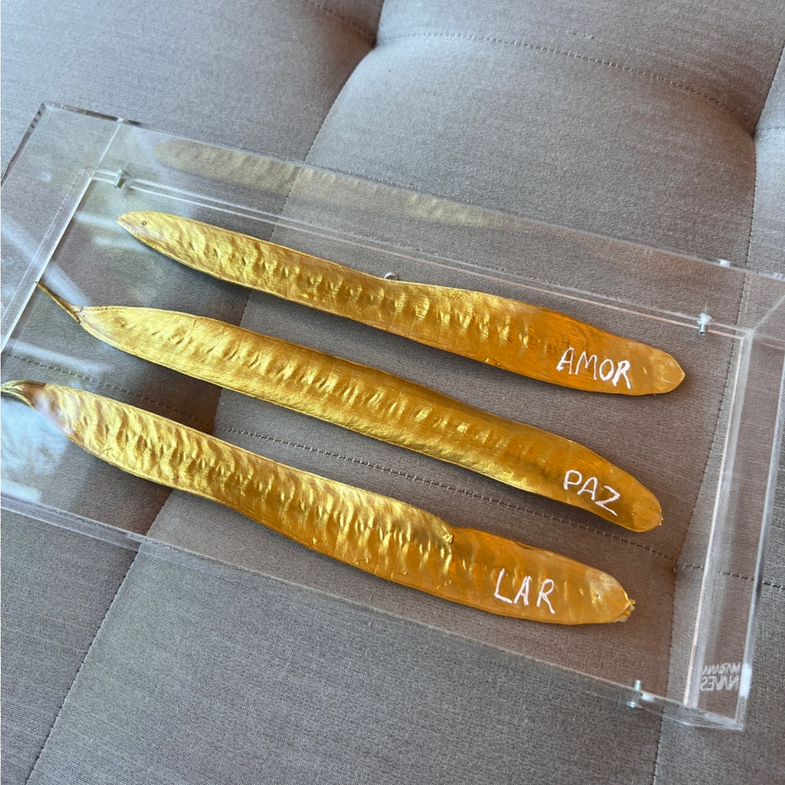 Escultura de folhas com escrito AMOR, PAZ, LAR. A peça é protegida por caixa expositora...