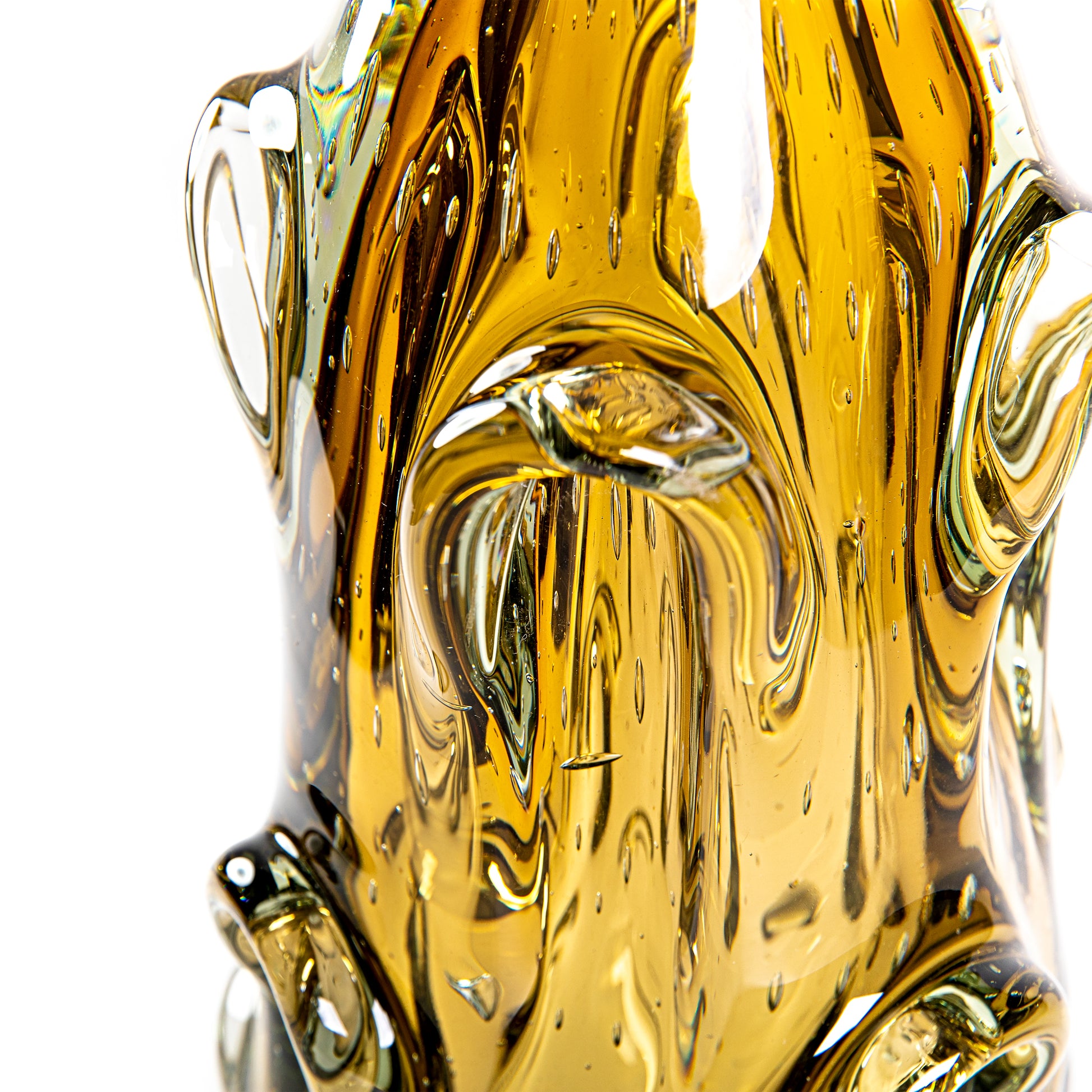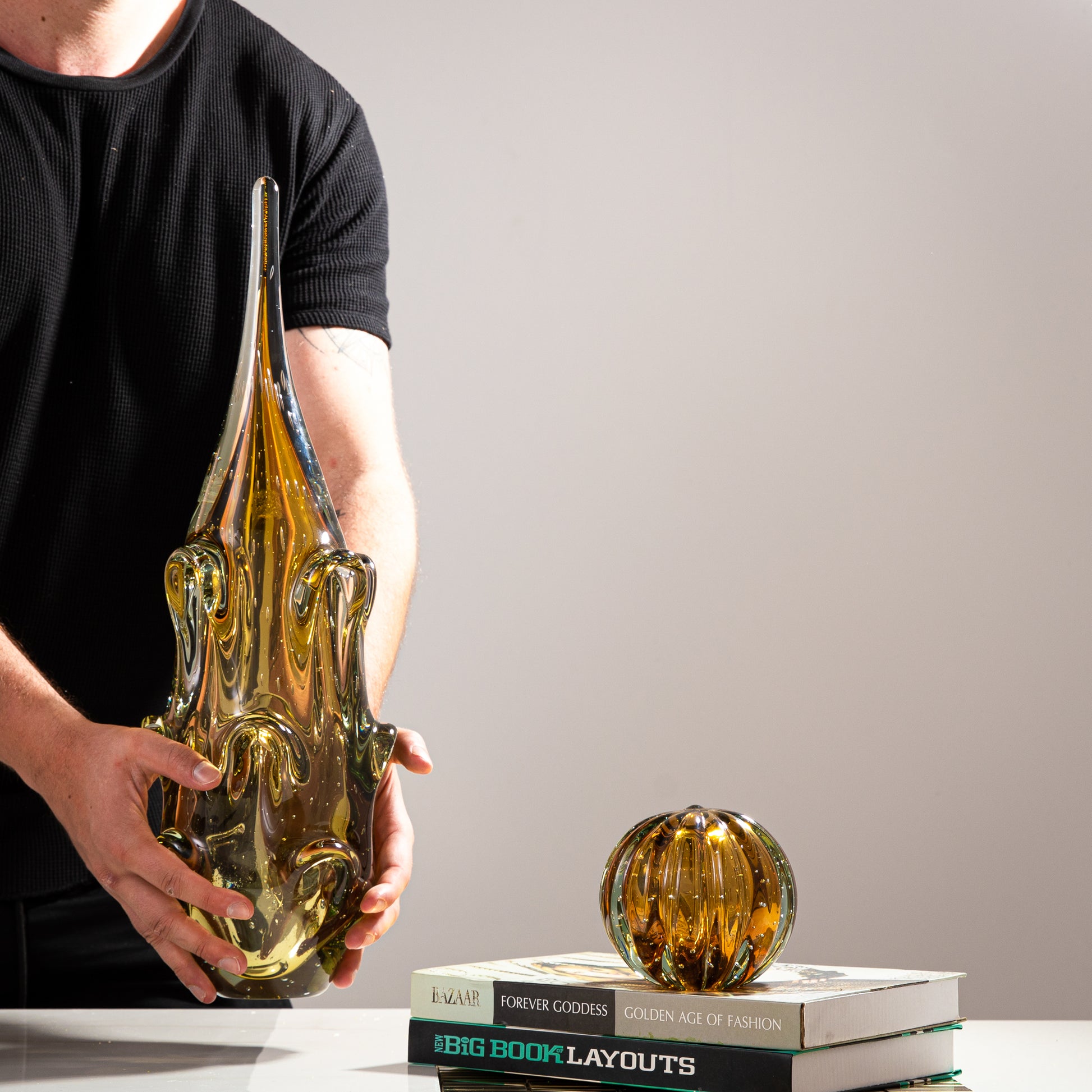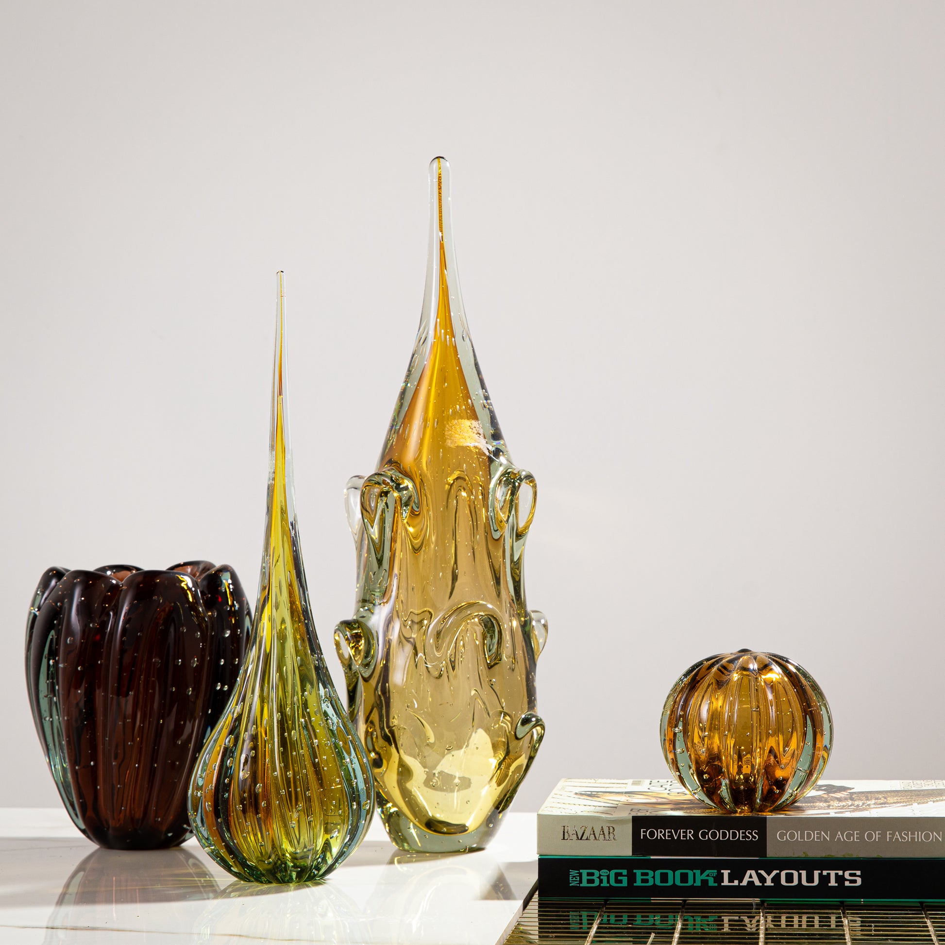 Murano Collection - Toda a beleza e a qualidade dos cristais feitos com a técnica de murano, a qual o vidro é moldado por meio do sopro e movimentos manuais, um processo artístico totalmente artesanal. Em tons âmbar esverdeados com design e formatos contemporâneos, cheio de estilo e personalidade, eles vão trazer elegância e sofisticação para ambientes exclusivos e cheios de charme.
