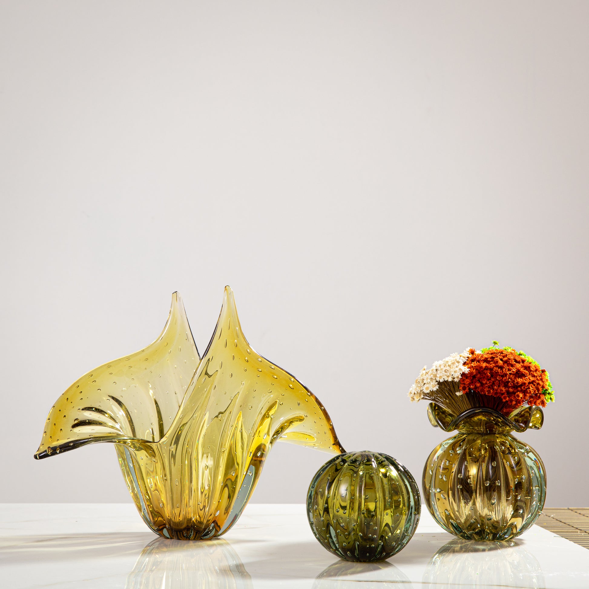 Murano Collection - Toda a beleza e a qualidade dos cristais feitos com a técnica de murano, a qual o vidro é moldado por meio do sopro e movimentos manuais, um processo artístico totalmente artesanal. Em tons ambar esverdeados com design e formatos contemporâneos, cheio de estilo e personalidade, eles vão trazer elegância e sofisticação para ambientes exclusivos e cheios de charme.