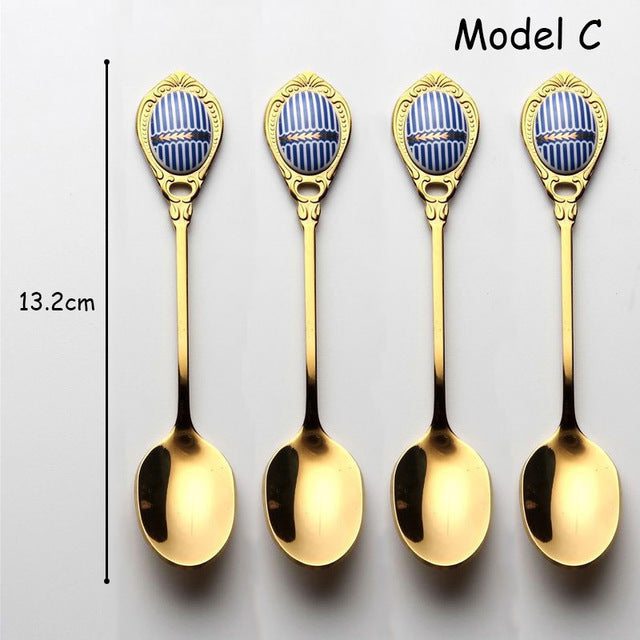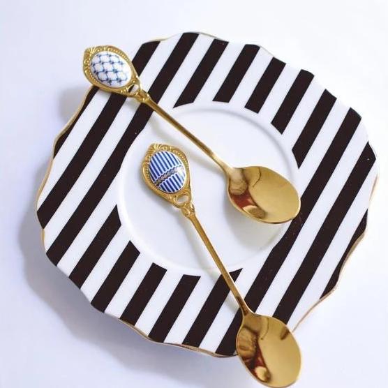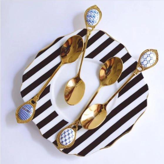 Com todo o charme possível esses talheres dourados com um detalhes em cerâmica nas cores clássicas azul e branco de um verdadeiro chá com uma tendência super vintage, traz a elegância necessária para seu chá, café da tarde, happy hour e composição da sua mesa.