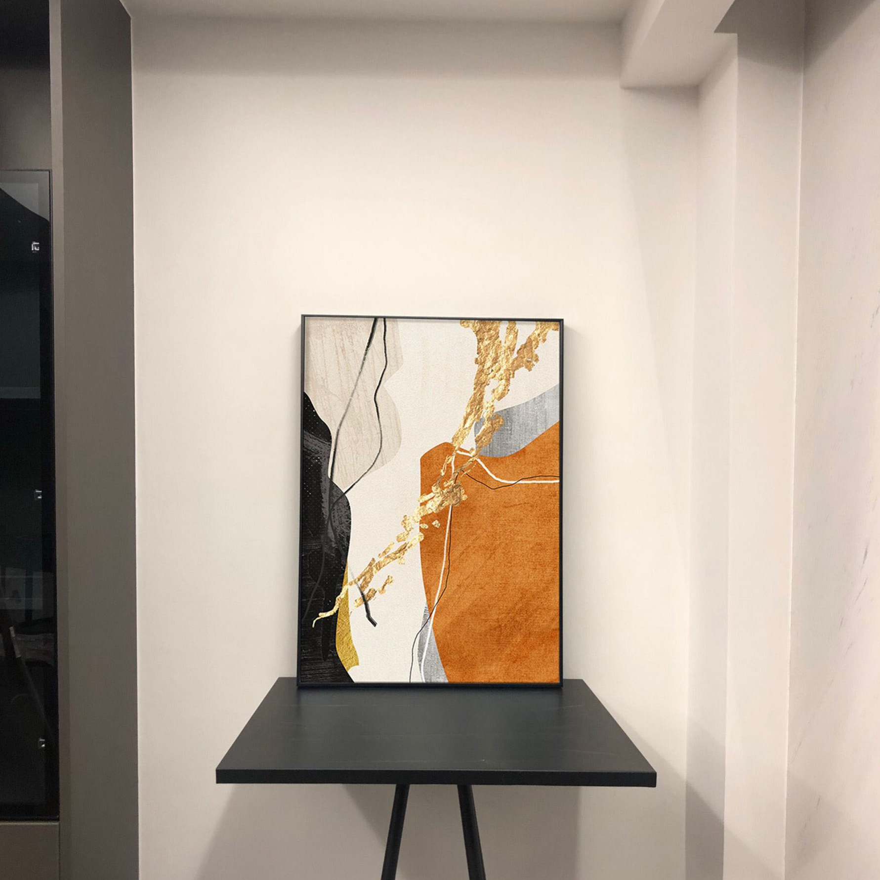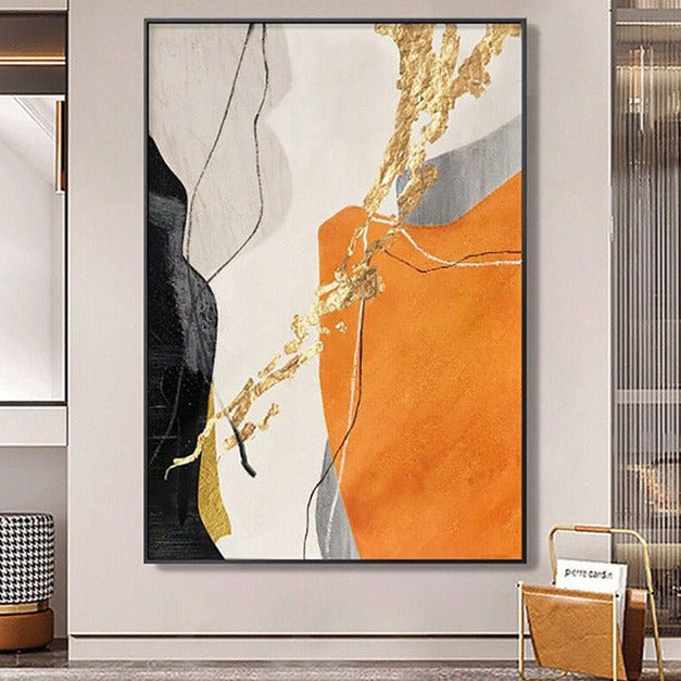 A "Tela Momentum" é pintada a mão em óleo sobre canvas e traz um estilo moderno com as formas abstratas, a elegância e leveza da base em tons neutros contratados com a atitude do detalhe em um tom atual de laranja vibrante e a sofisticação dos trabalhados em lâminas douradas. Uma verdadeira obra de arte contemporânea para encher o espaço de movimento, bom-gosto e personalidade!